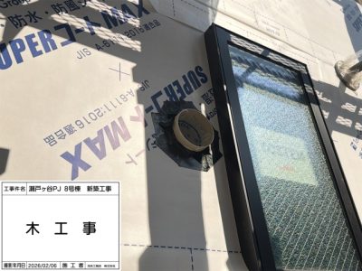 サッシ周り、防水シート、ウェザーシート、防水テープ施工。