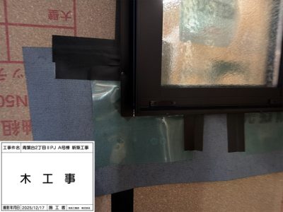 サッシ周り、防水シート、ウェザーシート、防水テープ施工。