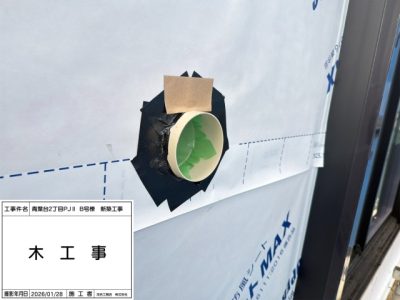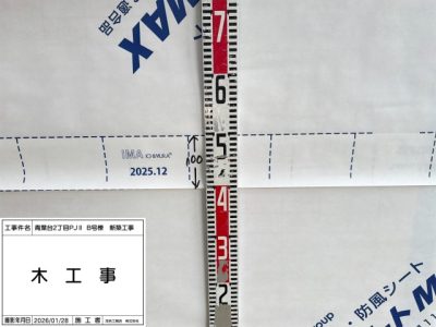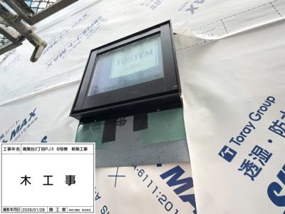 サッシ周り、防水シート、ウェザーシート施工(防水紙施工時に防水テープ施工)。